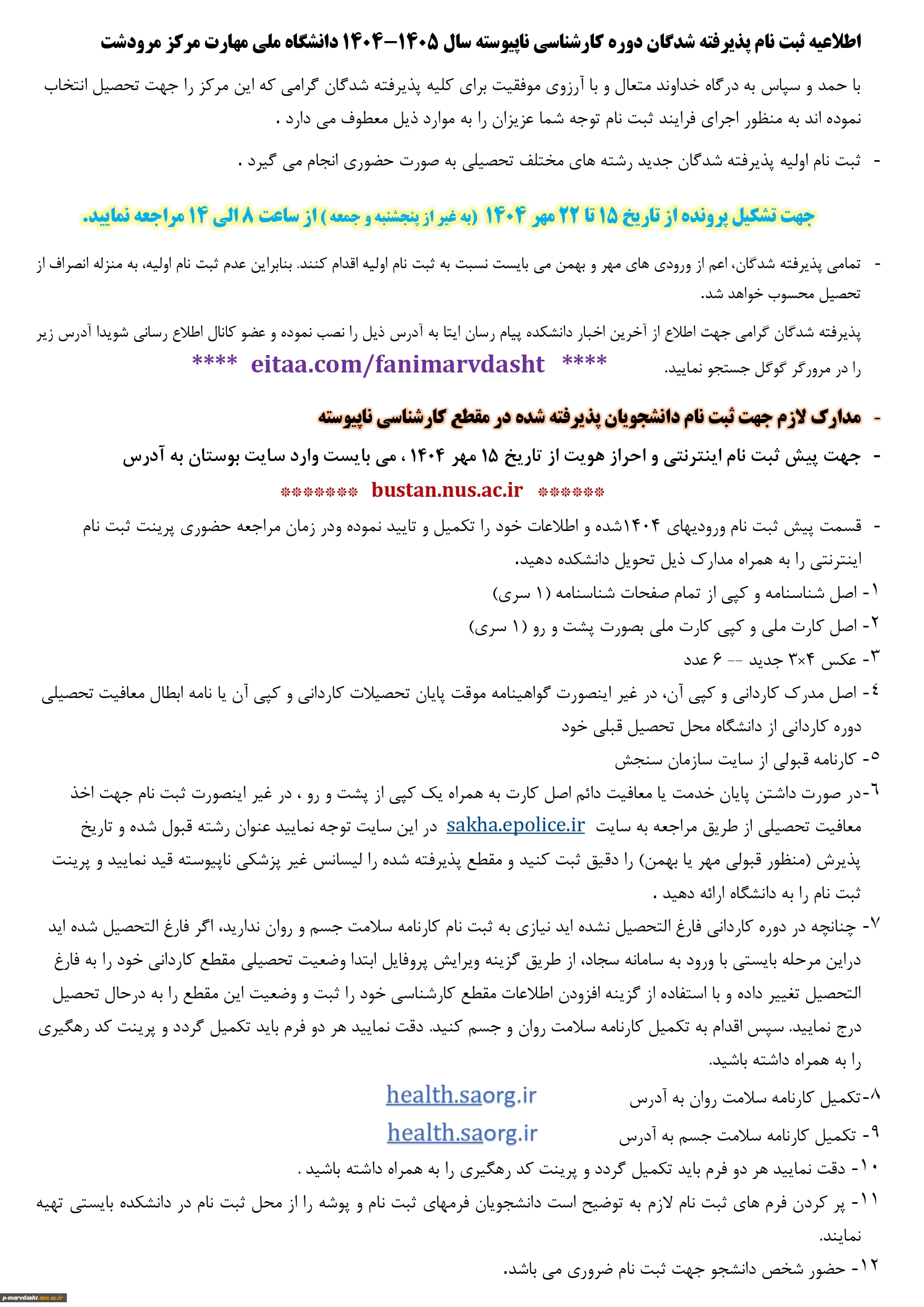 امتیاز دهید : اطلاعیه ثبت نام پذیرفته شدگان دوره کارشناسی ناپیوسته سال 1405-1404 دانشگاه ملی مهارت مرکز مرودشت 3 شنبه 12 مهر 1404 ساعت 8:57