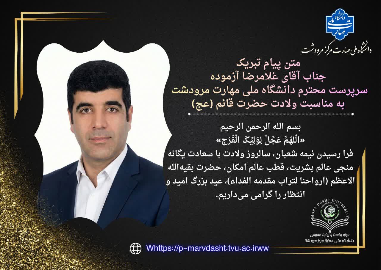 اینجانب ضمن گرامیداشت این ایام فرخنده، ولادت سراسر نور و سرور حضرت مهدی موعود (عج) را به محضر مقام معظم رهبری، ملت شریف ایران و بهویژه خانواده بزرگ دانشگاه ملی مهارت، اساتید گرانقدر، کارکنان خدوم و دانشجویان عزیز مرکز مرودشت تبریک و تهنیت عرض مینمایم.