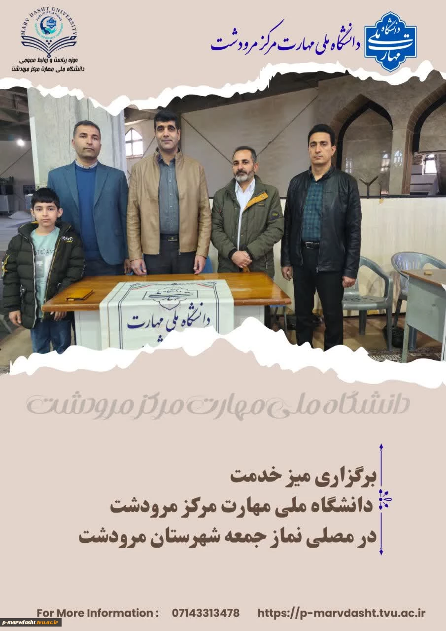 دانشگاه ملی مهارت مرکز مرودشت به مناسبت دهه مبارک فجر در روز جمعه ۱۷ بهمن ماه ۱۴۰۴، اقدام به برپایی میز خدمت در محل مصلی نماز جمعه شهرستان مرودشت نمود.